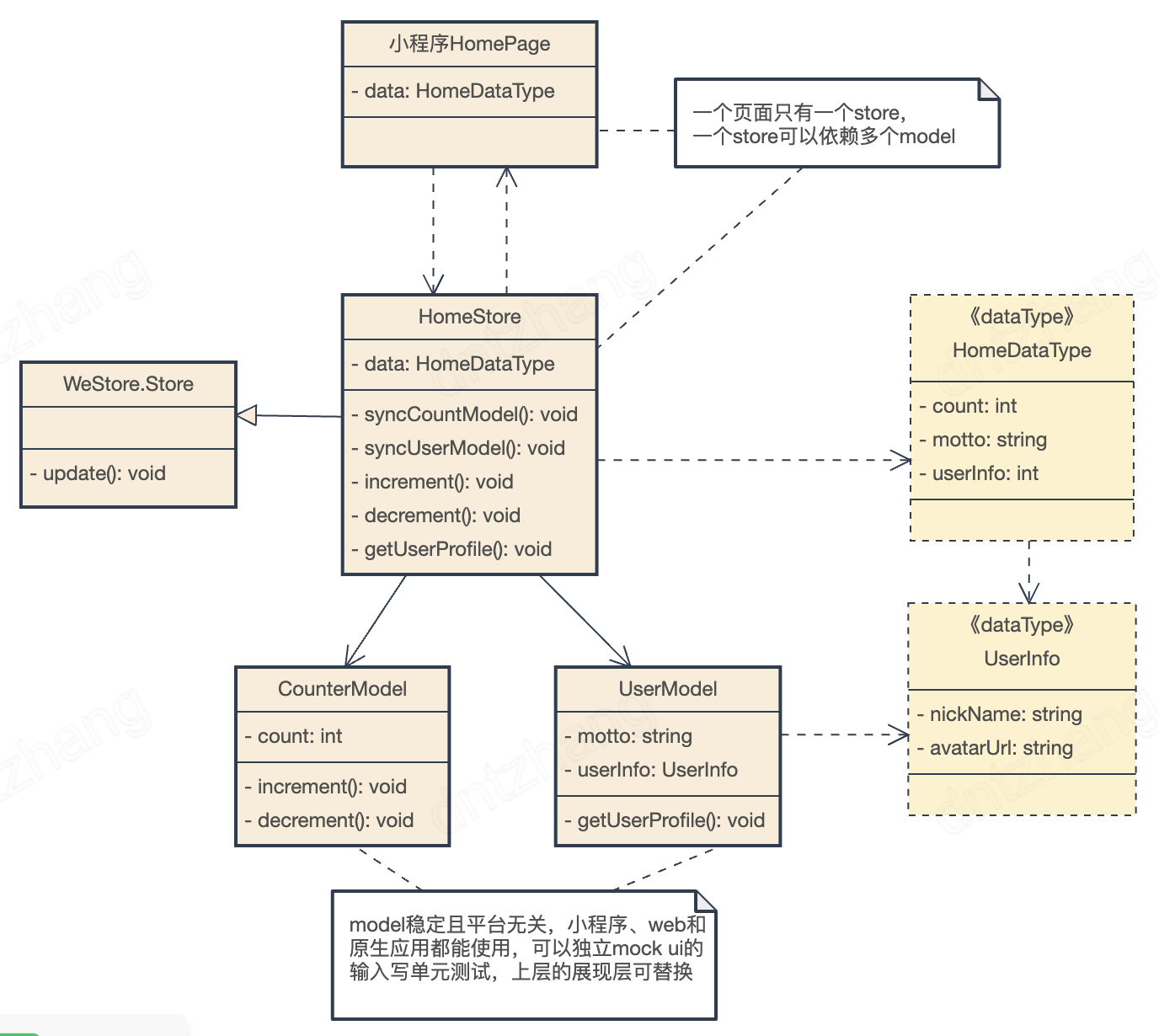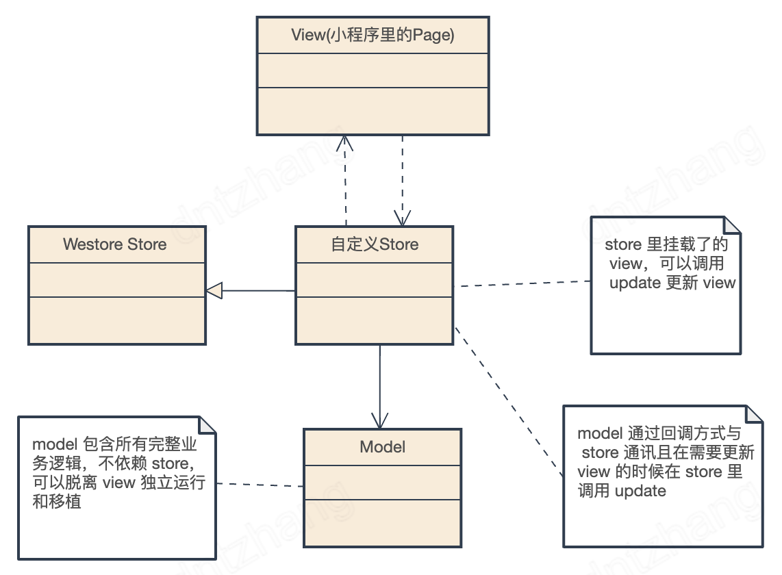 this . update ( ) 從目前來看,絕大部分的小程序項目都把業務邏輯堆積在小程序的Page 構造函數里,可讀性基本沒有,給後期的維護帶來了巨大的成本,westore 架構的目標把業務/遊戲邏輯解耦出去,Page 就是純粹的Page,它只負責展示和接收用戶的輸入、點擊、滑動、長按或者其他手勢指令,把指令中轉給store,store 再去調用真正的程序邏輯model,這種分層邊界清晰,維護性、擴展性和可測試性極強,單個文件模塊大小也能控制得非常合適。